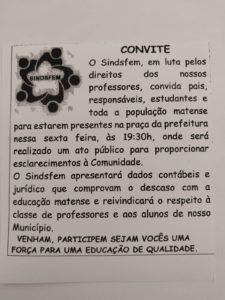 Reajuste sugerido pelo chefe do Executivo Municipal é muito longe do esperado pelos professores matenses, conforme a presidente do sindicato. Enquanto não há um entendimento entre os professores e o prefeito, os alunos são prejudicados.